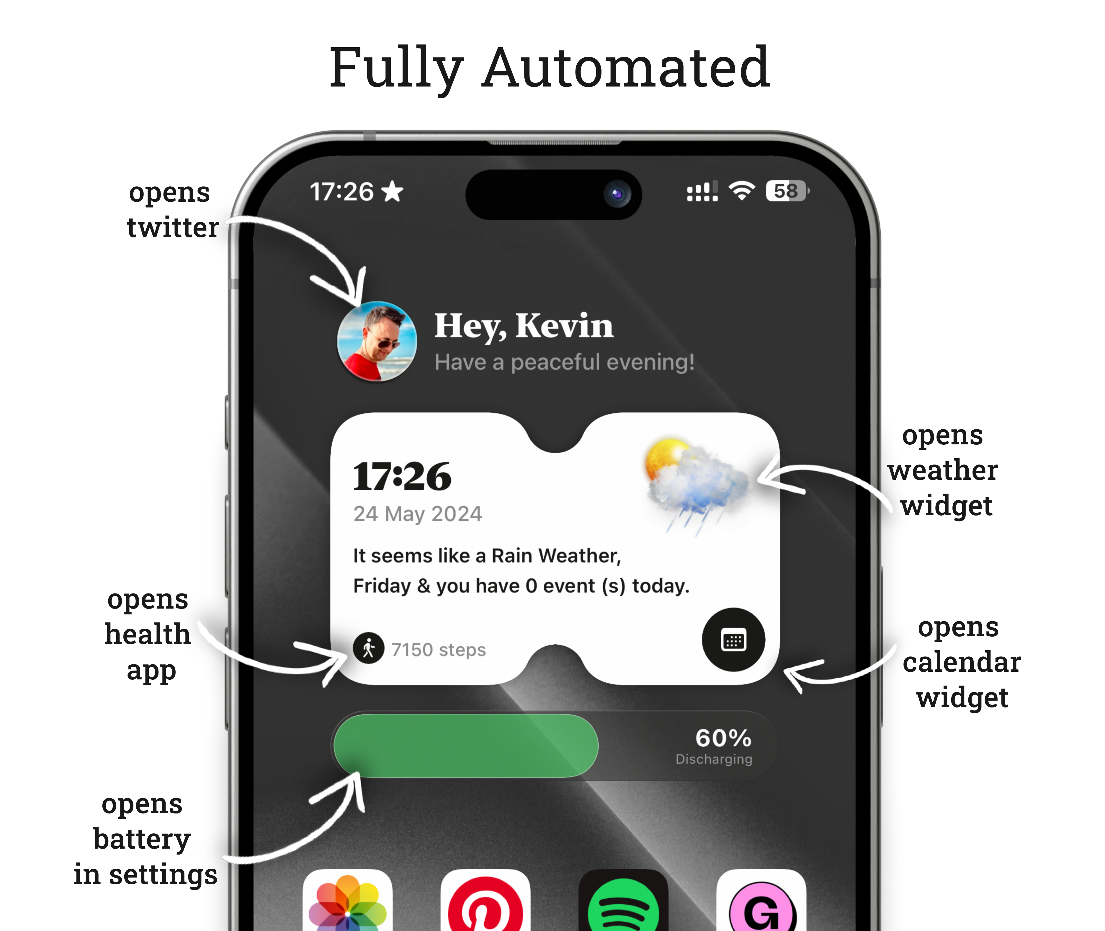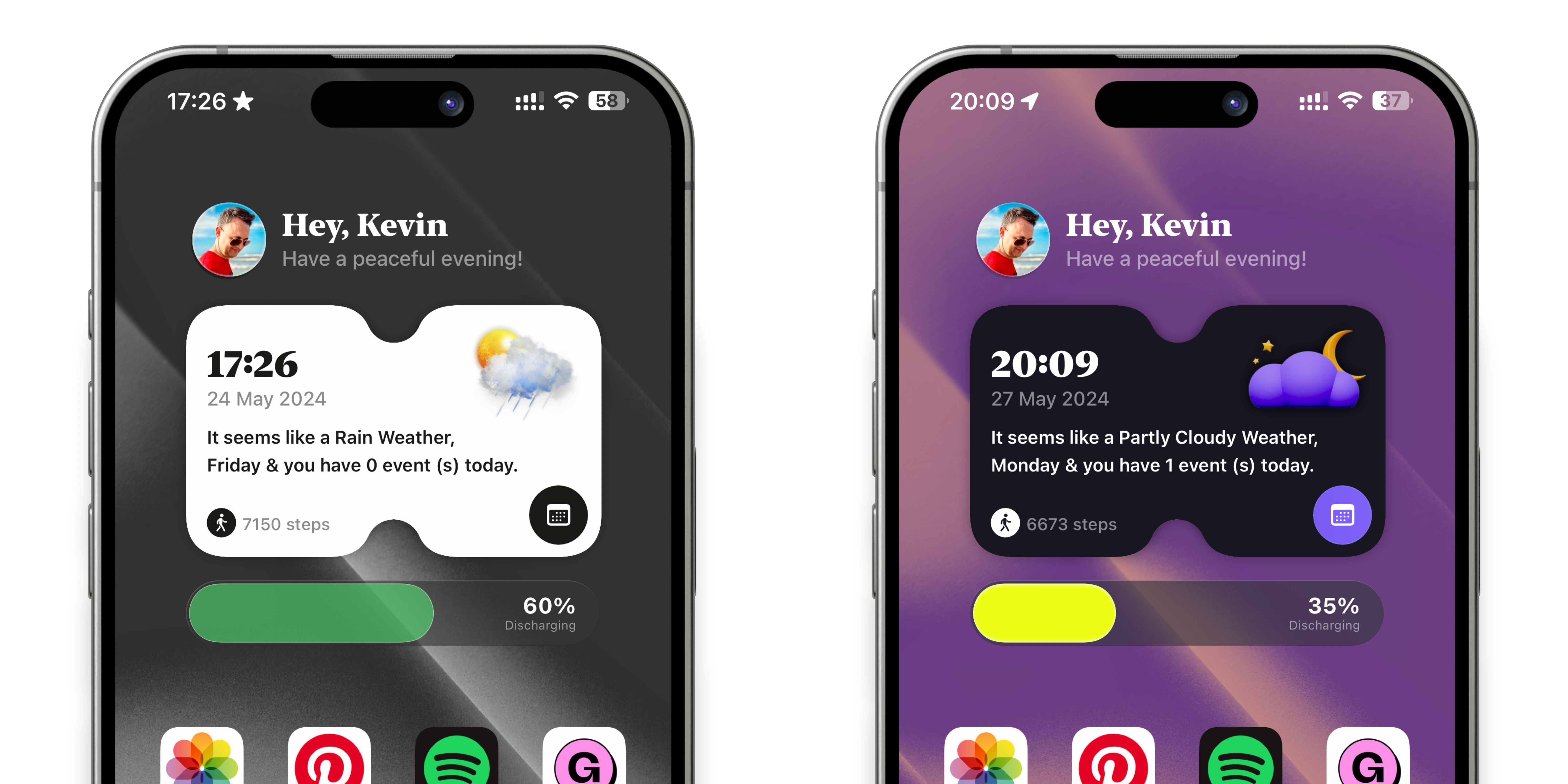 The first page presents a concise overview of the weather, date, time, step count, and upcoming events. At the top of the home widget, find an avatar display – tap to access Twitter or personalize it with an image of your choice.