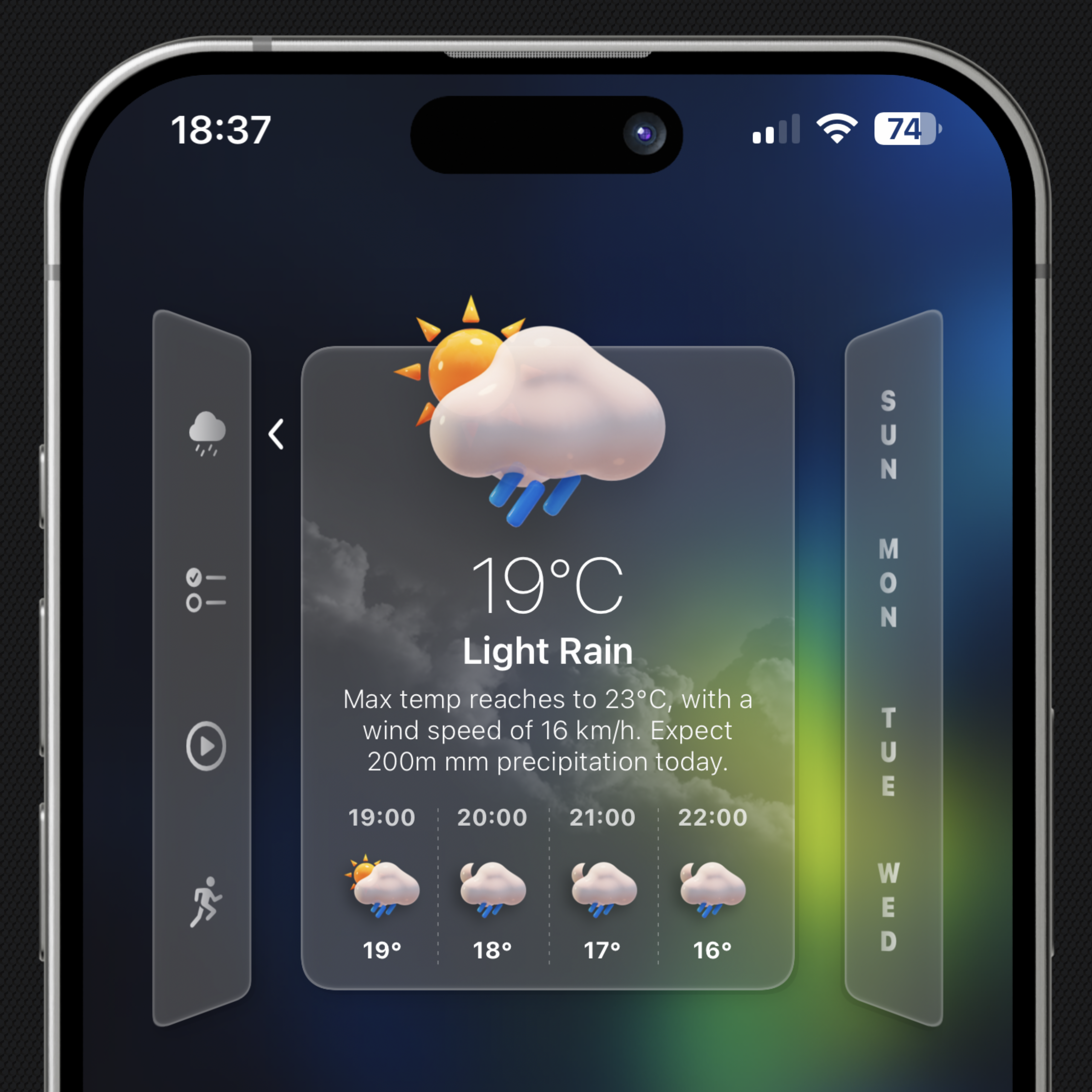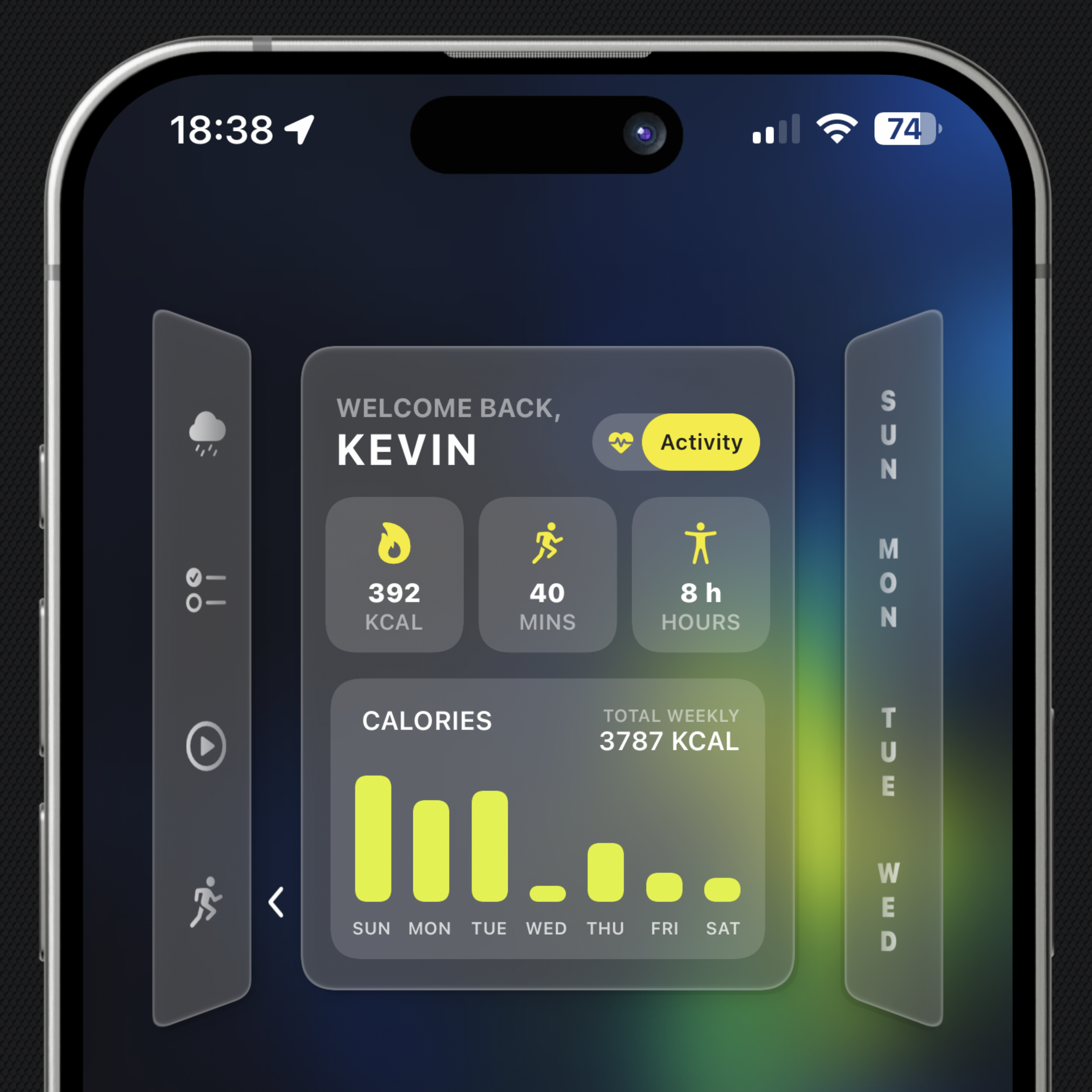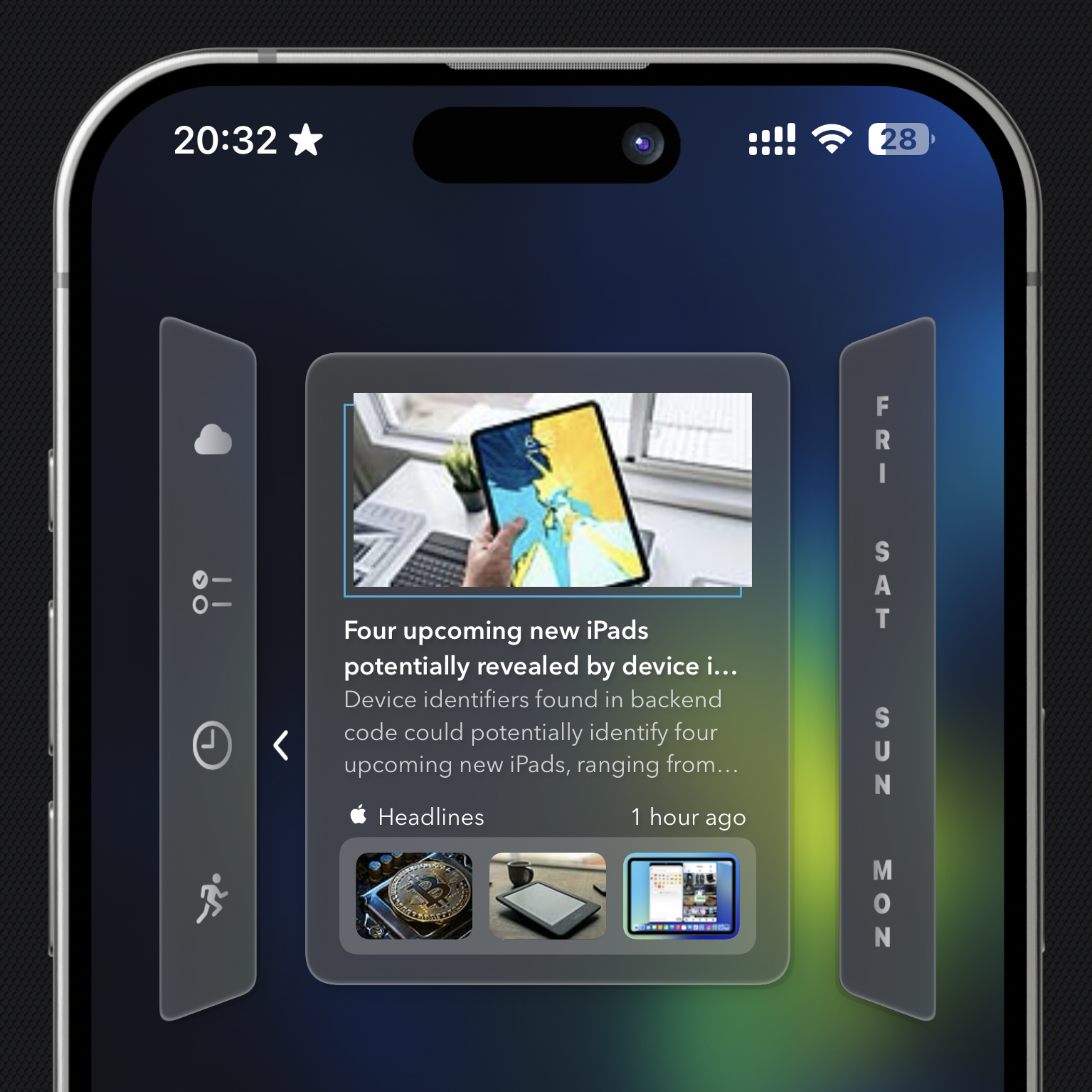 Introducing Vista: A sophisticated Widgy widget with a window-shaped design, featuring four dynamic tabs on the left for quick access to weather forecasts, calendar events, Apple Music or News (9to5Mac), and fitness/health information. The right side displays a concise three-day date overview.